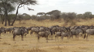 We were less than five minutes into the 1100-square-mile Tarangire National Park when we saw our first animals, and got our first look at the magnificient baobab trees. Gazelles are more plentiful than whitetail deer in Michigan, and they bounded gracefully across the prairies. So many animals were being pointed out, that I felt I needed to keep a record. So please indulge me as I share my list of animals from our first day: Maasai giraffe (the male has a bump between his horns), water buck, monitor lizard, wildebeest, zebra, warthog, blackface monkey or vervet monkey, baboon, elephants, and lions carrying off a freshly killed zebra.