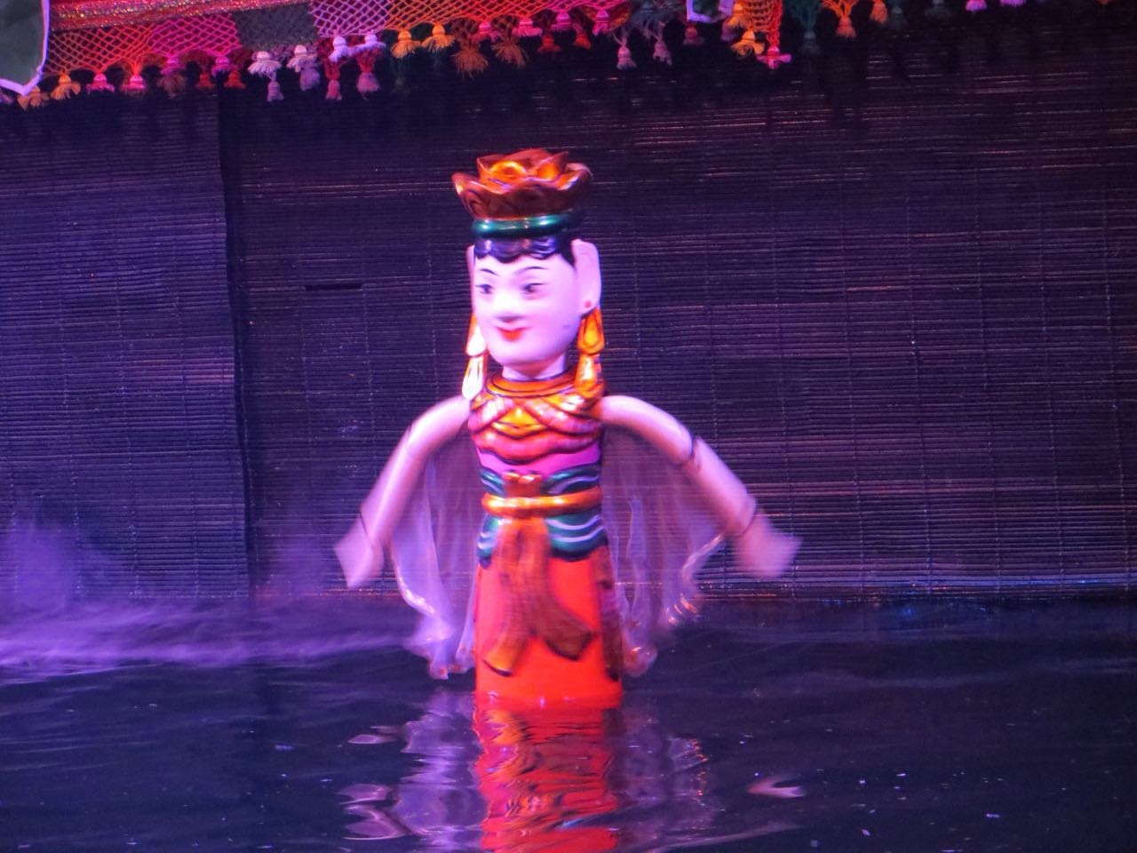 The many puppeteers came out at the end of the performance, waist deep in the water. They had been controlling the puppets with very long bamboo poles under the surface of the water. Water puppetry originated over 1000 years ago, when the low-lying Red River plains would flood during the rainy seasons each year. This uniquely-Vietnamese entertainment was created by the farmers looking for a way to entertain the people in their village during that time when no farming could be done. Each village's puppet troupe would act out mythological stories about Vietnam and its history. One famous story tells of a golden tortoise god in Hoan Kiem Lake that emerged to give King Ly a sword to fight off Chinese invaders. After his victory, the tortoise reclaimed the sword. "Hoan Kiem" means "returned sword."