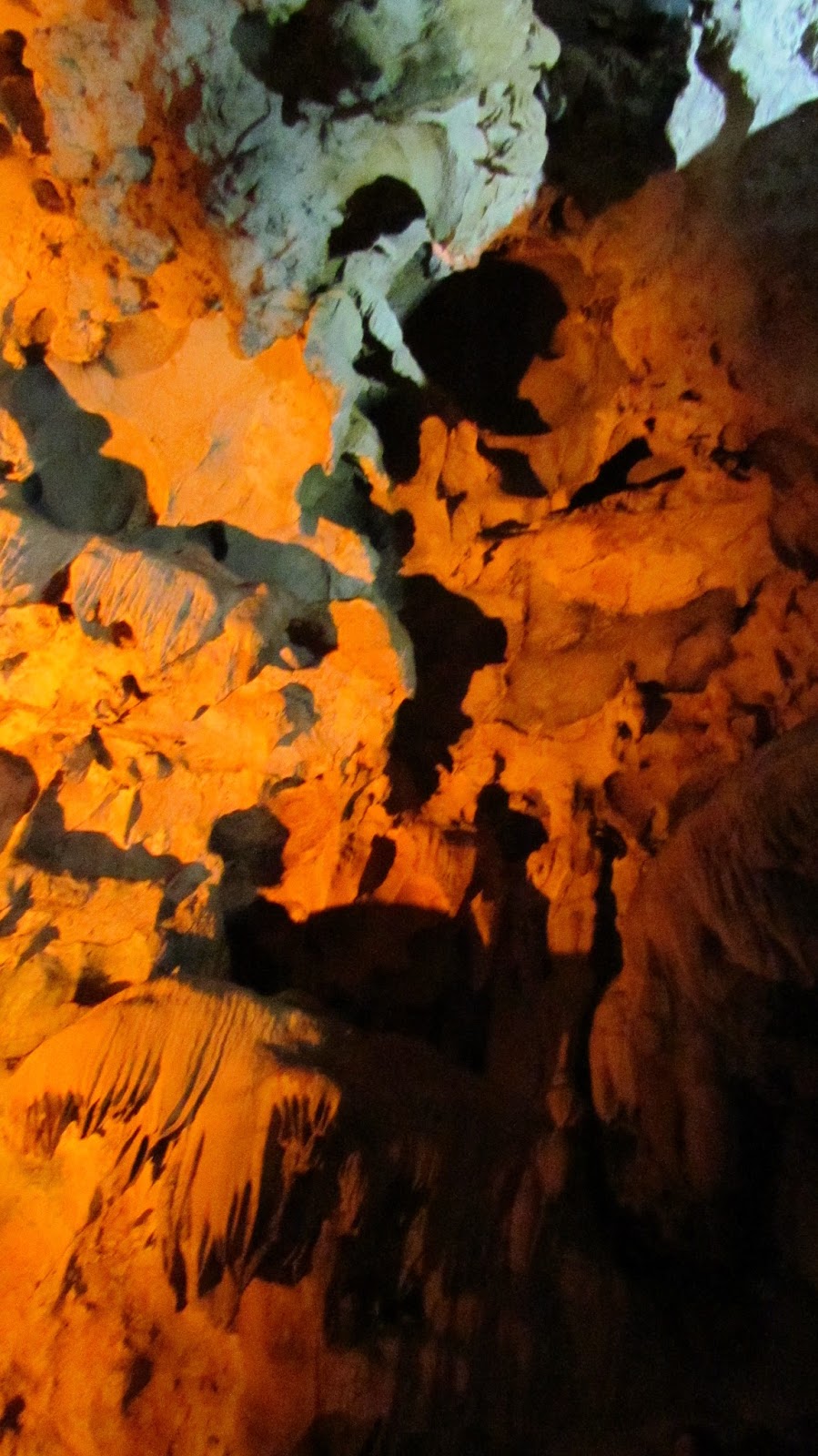 After lunch, we docked at the entrance to a large cave, just as the rains began to fall in earnest. We were pretty drippy by the time we took the long walk and many stairs into the cave. Dau Go Cave is a huge limestone grotto lit with colored lights for the tourists. Again, many formations were given names - dragon, turtle, lion - and stalactites and stalagmites abounded. A nice chance to walk around, but lots of tour groups crowding through.